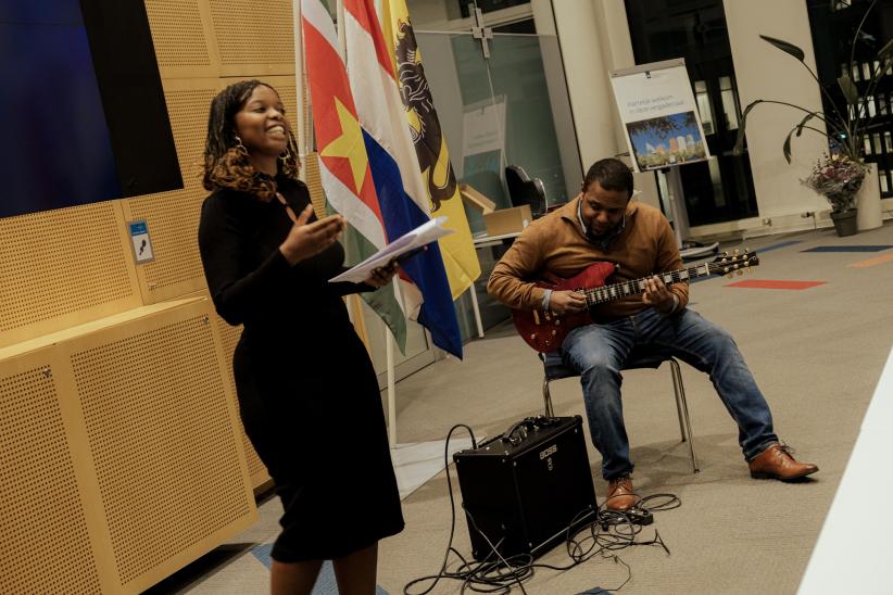 Voor een poëtische noot zorgde woordkunstenaar Lisette Ma Neza, die onder muzikale begeleiding een prachtige ode aan het Nederlands bracht.