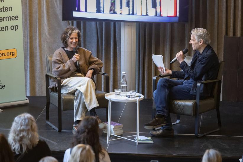 Het gesprek werd opgenomen in de bibliotheek van conferentiecentrum Bovendonk, voor een publiek van Nederlandse en Belgische onderwijsprofessionals, tijdens onze tweedaagse conferentie ‘Iedereen taalcompetent: werken met rijke teksten’.