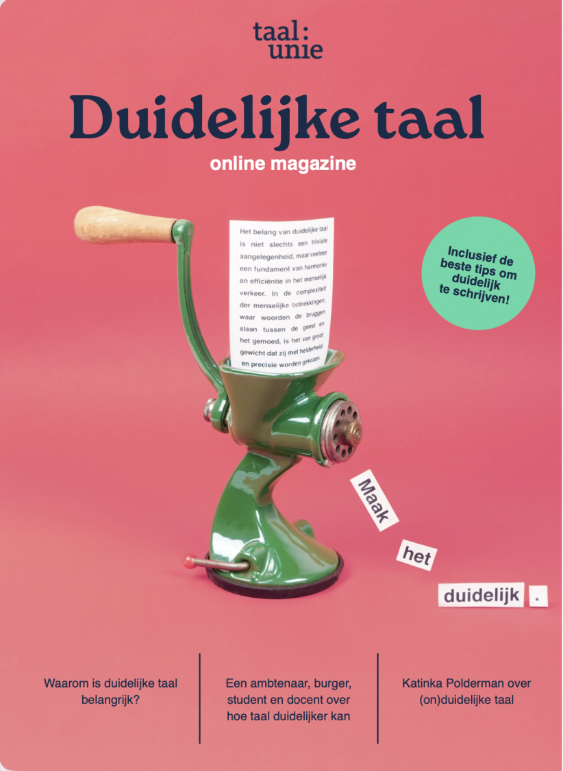Het online magazine over duidelijke taal is speciaal ontwikkeld voor studenten. Het magazine biedt een frisse, inspirerende kijk op het belang van duidelijk communiceren voor jezelf en de samenleving – met interviews, voorbeelden uit de praktijk, praktische tips, hoe je AI kunt inzetten, actuele ontwikkelingen, een beslisboom van Katinka Polderman en nog veel meer.